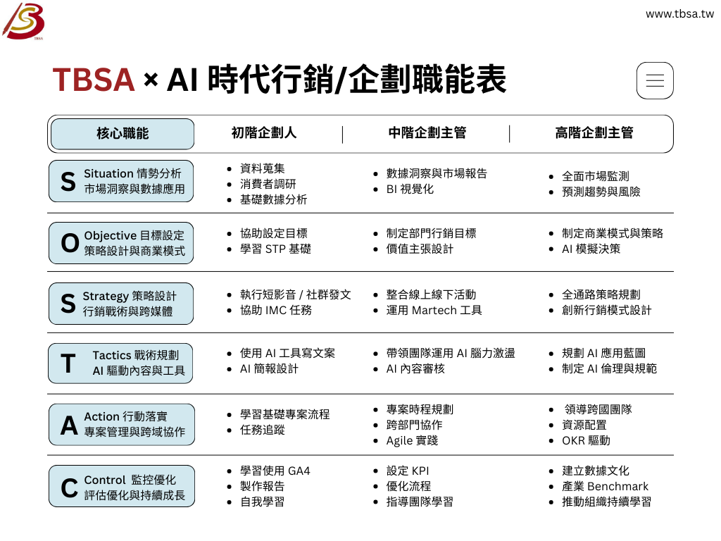 企劃力該被看見,也該被準確衡量。TBSA 以「職能為本」建立等級檢定,讓個人有清楚的學習路徑,企業有一致的人才語言,學校能有效對接教學與實務。